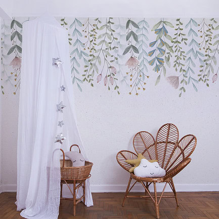 O Painel de parede Jardim Encantado é feito com matéria-prima importada e impresso no Brasil. O papel de parede non-woven combina fibras naturais e sintéticas, sendo mais moderno que o tradicional. Ele permite que a parede “respire”, evitando mofo e bolor escondidos. Além disso, é fácil de limpar: basta um pano úmido!