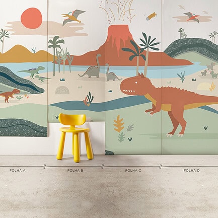 O Painel de parede Vale dos Dinos é feito com matéria-prima importada e impresso no Brasil. O papel de parede non-woven combina fibras naturais e sintéticas, sendo mais moderno que o tradicional. Ele permite que a parede “respire”, evitando mofo e bolor escondidos. Além disso, é fácil de limpar: basta um pano úmido!