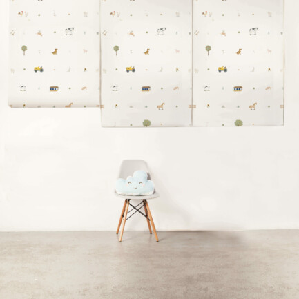 O Papel de parede Fazendinha é feito com matéria-prima importada e impresso no Brasil. O papel de parede non-woven combina fibras naturais e sintéticas, sendo mais moderno que o tradicional. Ele permite que a parede “respire”, evitando mofo e bolor escondidos. Além disso, é fácil de limpar: basta um pano úmido!