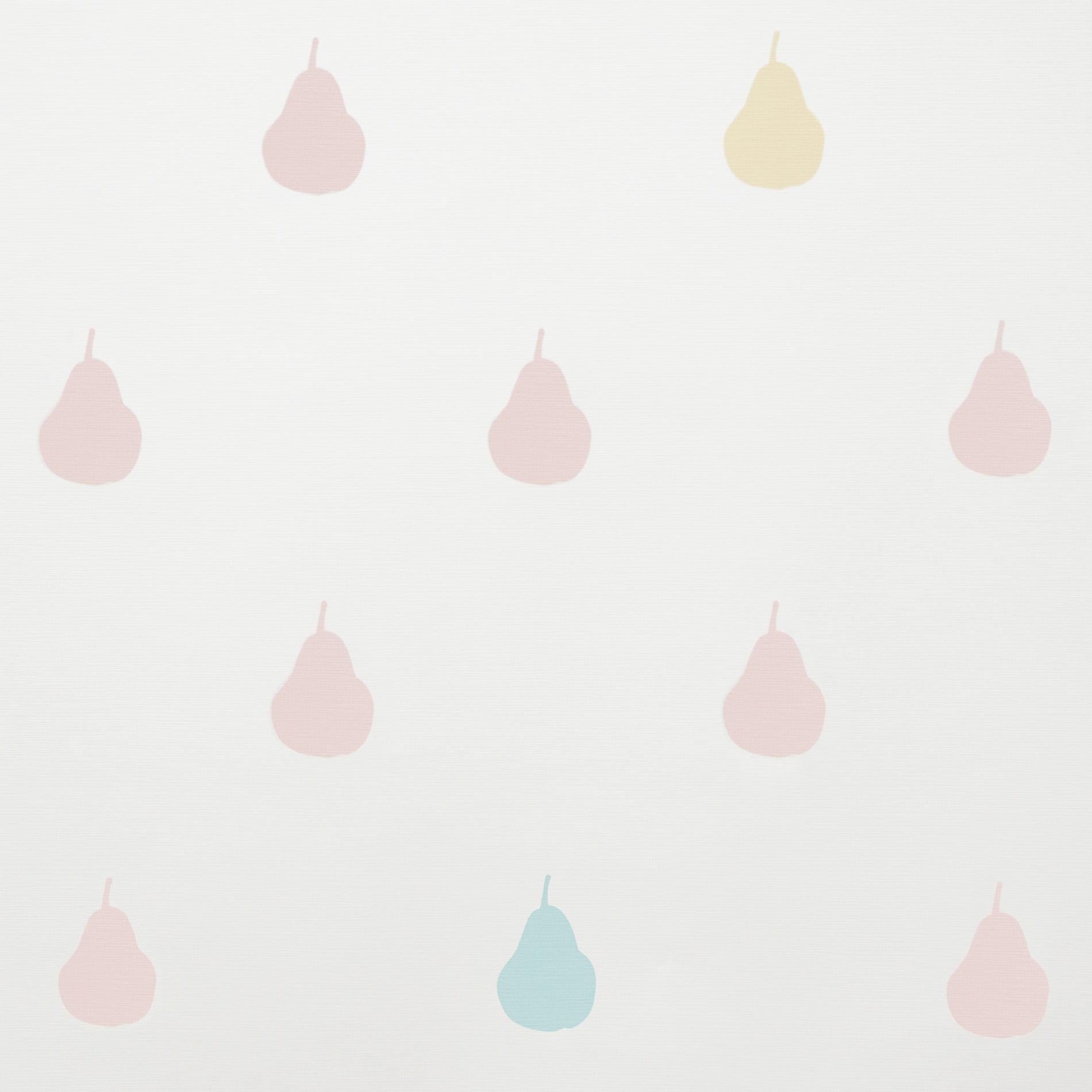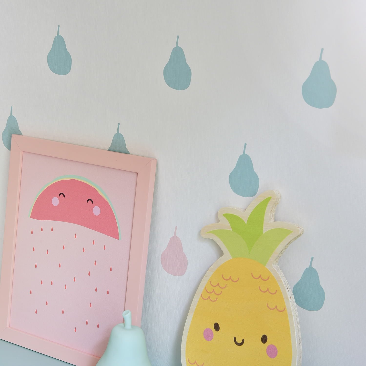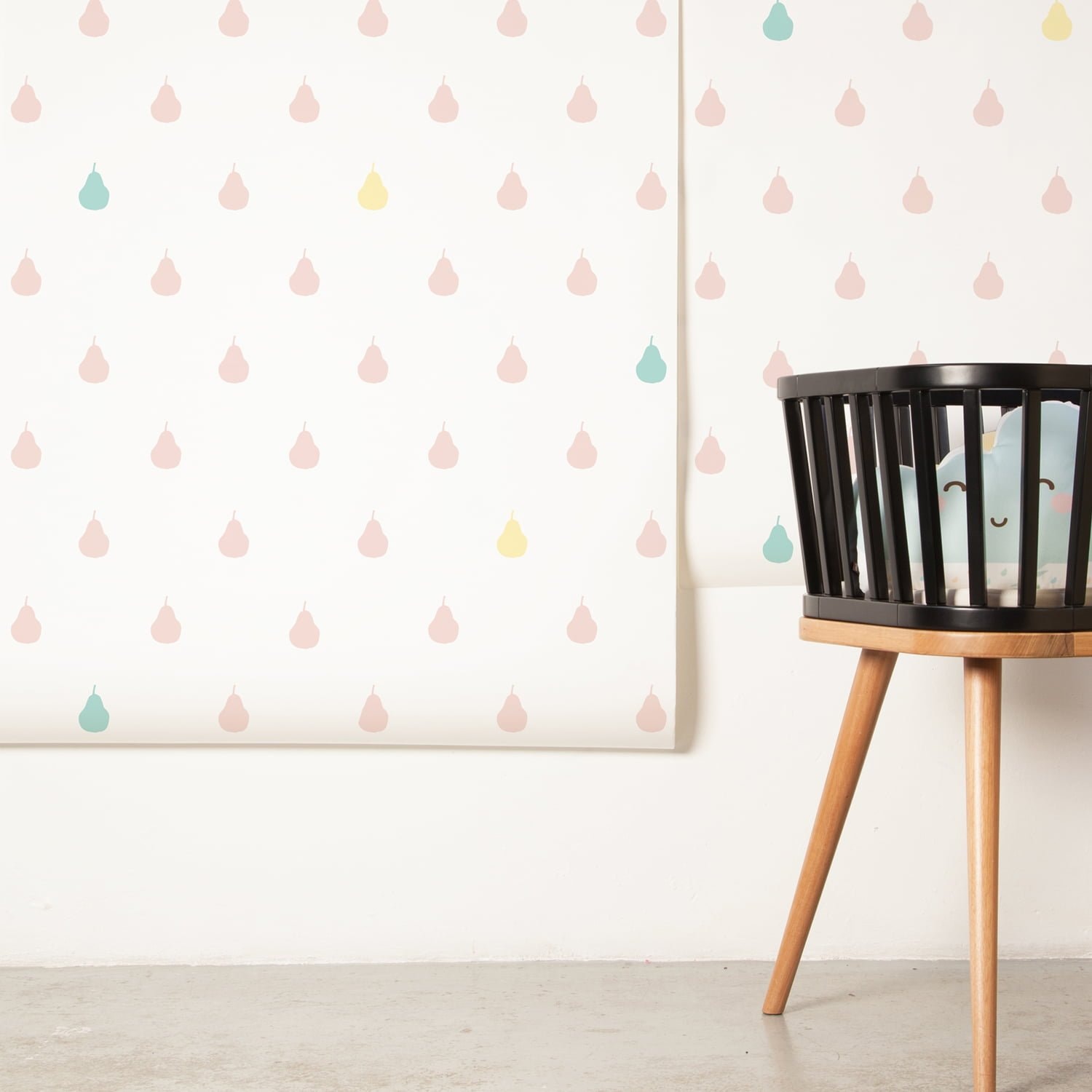 O Papel de parede Pera, tem estampa de peras nude ou turquesa com detalhes coloridos. Uma criação exclusiva da Mü Decor.