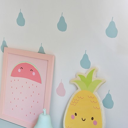 O Papel de parede Pera da Mü Decor tem matéria-prima importada e é impresso no Brasil.