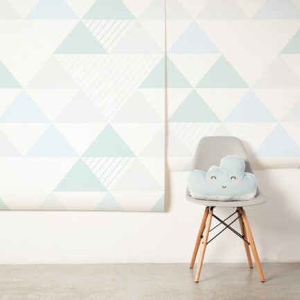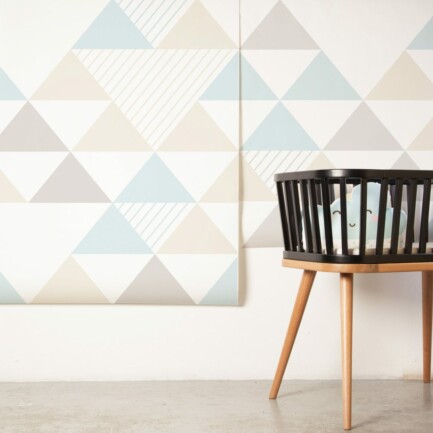 O Papel de parede Triângulos da Mü Decor tem matéria prima importada e é impresso no Brasil, conhecido como non-woven, ele é uma combinação de fibras naturais e sintéticas. Mais moderno que o tradicional papel de parede, ele permite que a parede “respire” não acumulando mofo ou bolor escondido. Aceita limpeza com pano úmido.