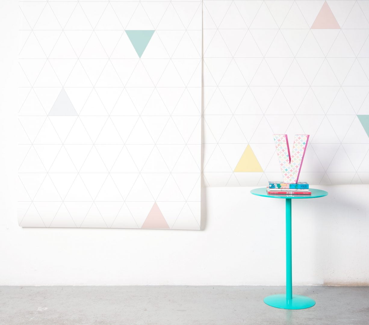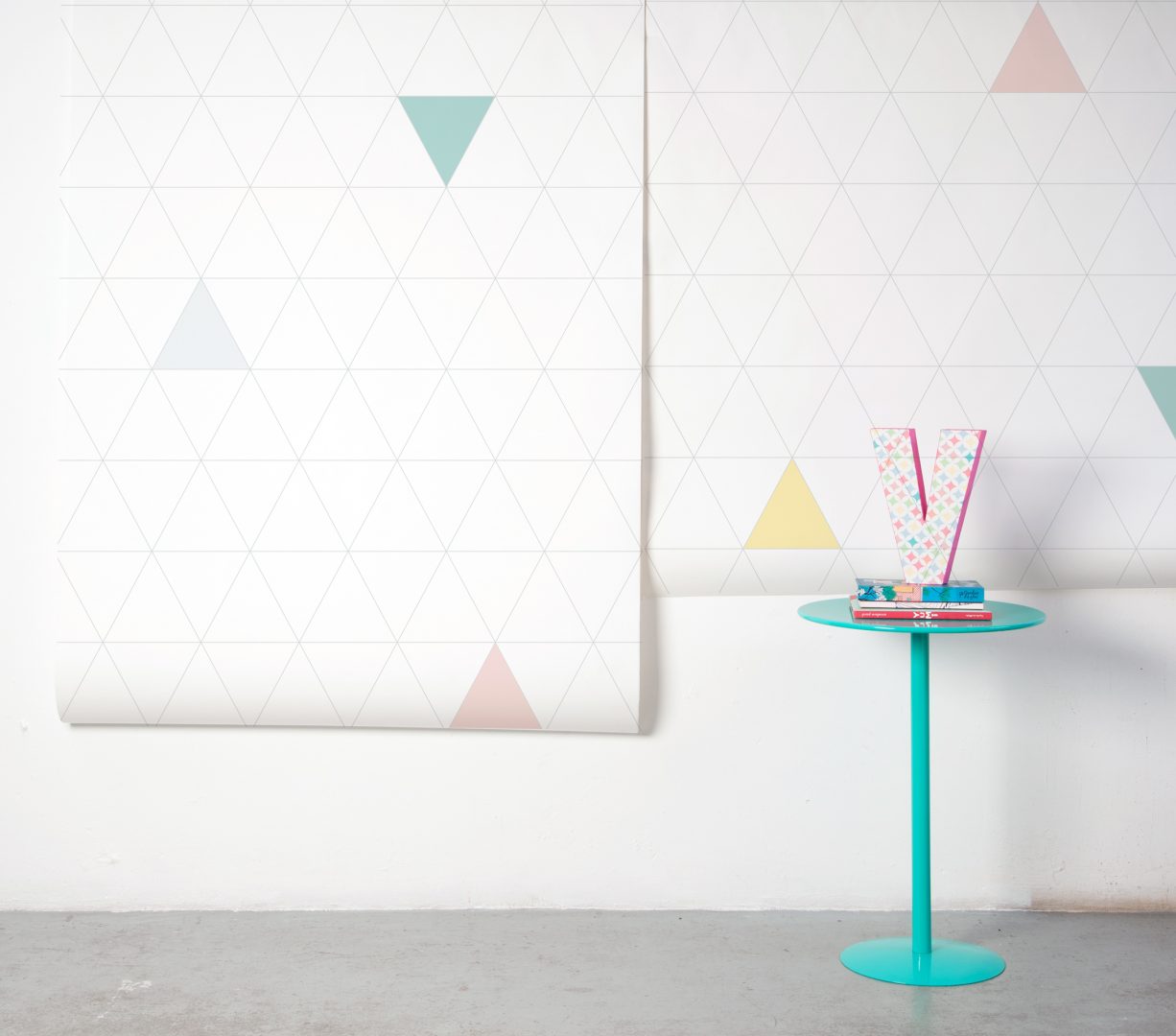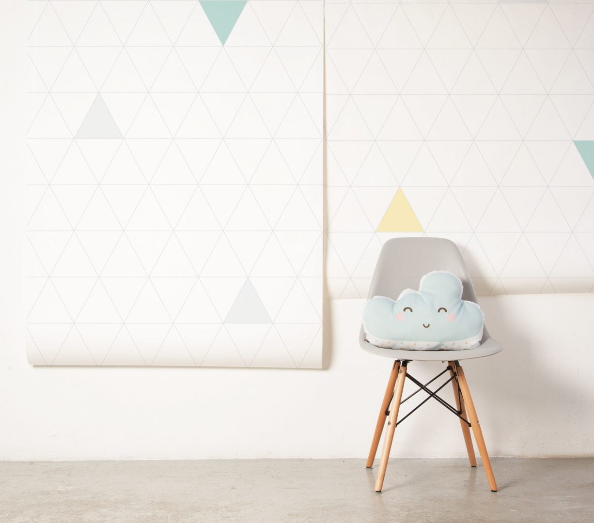 O Papel de parede Triângulos-Traço da Mü Decor tem matéria prima importada e é impresso no Brasil, conhecido como non-woven, ele é uma combinação de fibras naturais e sintéticas. Mais moderno que o tradicional papel de parede, ele permite que a parede “respire” não acumulando mofo ou bolor escondido. Aceita limpeza com pano úmido.