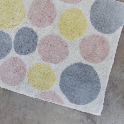 O Tapete de Algodão Bubbles é produzido com fibra natural, 100% algodão e tingido com tintas atóxicas, garantindo segurança e qualidade.